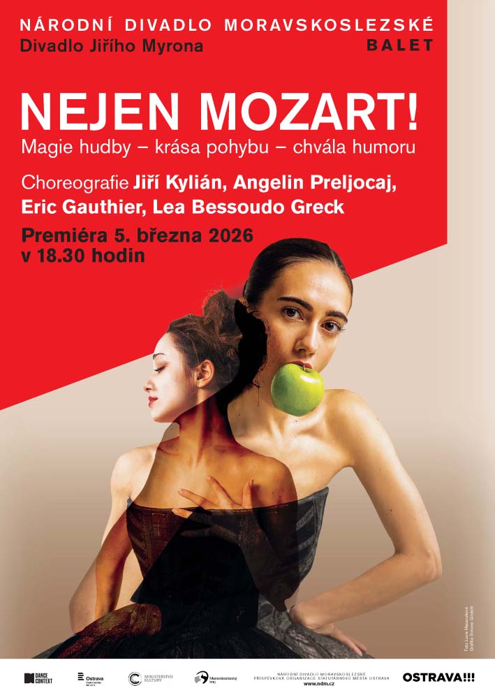 Choreografie Jiří Kylián, Angelin Preljocaj, Eric Gauthier, Lea Bessoudo Greck Komponovaný večer Nejen Mozart! není pouze oslavou tance jako umělecké formy, ale také hlubokým ponorem do lidské emocionality. Těžiště večera tvoří dvě odlišné, a přitom spřízněné choreografie Jiřího Kyliána Sechs Tänze a Petite Mort. Obě se opírají o geniální hudbu Wolfganga Amadea Mozarta a ukazují dvě různé tváře lidského života. Zatímco titul Sechs Tänze se s nadsázkou, humorem a špetkou absurdity vysmívá společenským konvencím a přetvářce, titul Petite Mort představuje čistou, téměř mytickou oslavu tělesnosti, lásky a vášně. Tato ikonická Kyliánova díla pak doplní několik dalších choreografií. Jednou z nich bude duet Balet 102 od bývalého sólisty Stuttgartského baletu a dnes mezinárodně uznávaného choreografa Erica Gauthiera, který si neotřelým a vtipným způsobem hraje s variabilitou tanečních pozic. A představíme i tvorbu choreografky a audiovizuální umělkyně francouzsko-izraelského původu Ley Bessoudo Greck, která již s ostravským baletem úspěšně spolupracovala při tvorbě choreografie Šárka pro inscenaci ČISTÁ RADOSTance. Večer Nejen Mozart! tak bude plný kontrastů, emocí i humorného nadhledu. Premiéra 5. března 2026 v Divadle Jiřího Myrona |